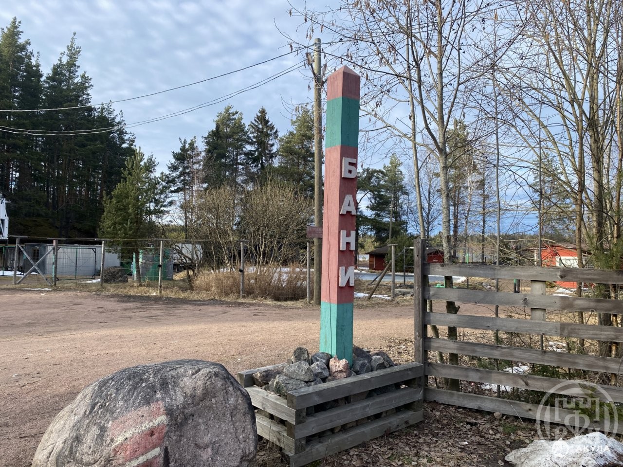 Домики-бани находятся в окружении красивого леса, территория самого комплекса огорожена и находится под охраной. Название `Пограничный ` отражено в стилевом оформлении комплекса: пограничный столб, ограждение по периметру - колючая проволока, на территории стоит оставшийся со времен ВОВ дзот с достопримечательностями, действующая полевая кухня.