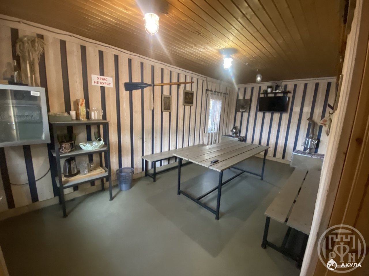 В банных домиках есть в наличии просторная комната отдыха с большим столом и диваном, раздевалка, душевая, санузел. В парной установлена печь, которая топится дровами по-белому.