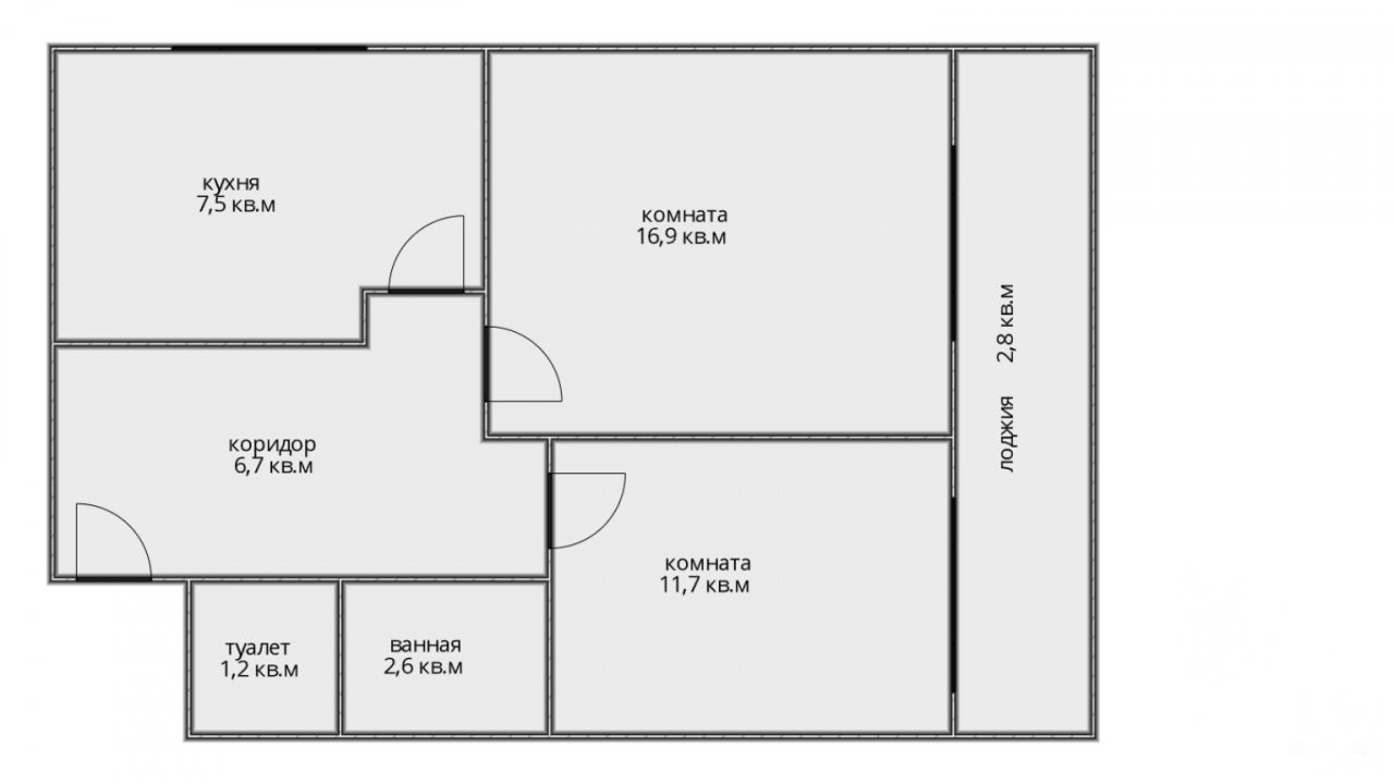 Общая площадь квартиры 46, 6 кв.м, комнаты изолированные 11, 7 кв.м + 16, 9 кв.м, кухня 7, 5 кв.м, вместительная прихожая, санузел раздельный, просторная лоджия с видом на зеленый сквер (не входит в площадь квартиры).